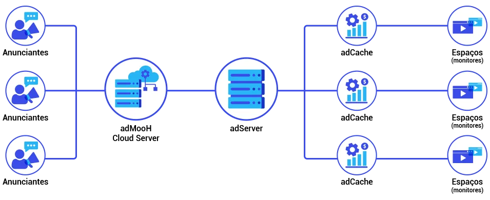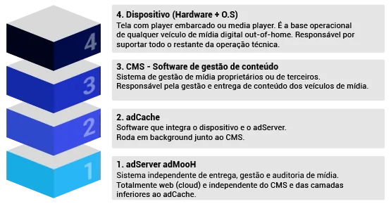 Lidamos com milhares de telas, milhões de pessoas, bilhões de impactos. Não há mais espaço para burocracias e imprecisões. Com o adServer, oferecemos informações transparentes mesmo em um mundo de dados quase incalculáveis independentemente dos outros participantes de uma campanha DOOH. Confira a estrutura: